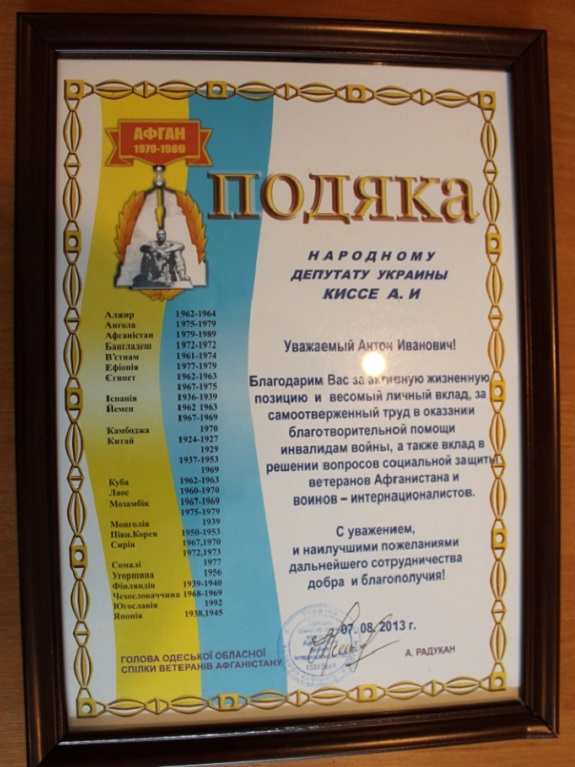 Подчеркнём, что народный депутат Украины на протяжении долгого времени оказывает всяческую поддержку ветеранам афганской войны. К слову, благодаря Антону Киссе в Арцизе был установлен памятник воинам-афганцам. В свою очередь, ветераны войны, чувствуя поддержку бессарабского нардепа, пытаются разными способами выразить ему свою благодарность. В частности, за подарок машины Виктору Печеву Антон Киссе получил благодарственную грамоту.