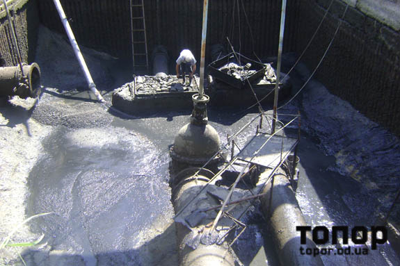 Чрево резервуара-отстойника, куда рабочие спускаются, чтобы вручную почистить его от грязи